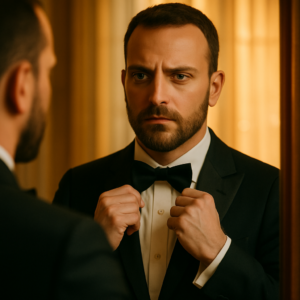 A young man in a sharp black tuxedo, adjusting his tie in front of a mirror with a calm and confident expression. Wearing black sunglasses. The scene is warmly lit with golden ambient lighting from behind the sheer white curtains, creating a soft, cinematic atmosphere. The mirror reflection shows only the back of his head and shoulder, while the main focus is on his front view. Elegant, luxurious setting, shallow depth of field, high resolution, professional studio look.” 8k resolution.