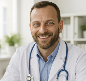A man wearing a white doctor’s coat over a light blue shirt, with a blue stethoscope hanging around his neck. He is sitting at a desk, writing on a notebook while looking SERIOUSLY at the person in front of him. The setting is a bright doctor’s office. The man has the face and hairstyle of the individual shown in the uploaded photo. Must have the same pose and clothing style as the doctor’s reference photo. No visible tattoos. Realistic details, professional photography style.